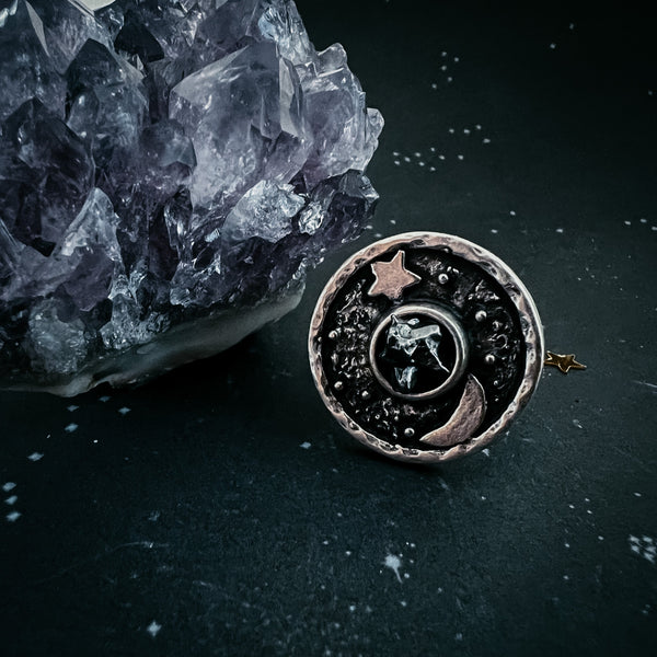 Celebrate your connection to the cosmos with the Night Sky Ring with Raw Meteorite. This striking ring features a genuine piece of raw meteorite at its center, surrounded by a halo evoking the night sky. Ideal for science lovers, astronomy students, or anyone who appreciates a piece of the universe in their everyday style.