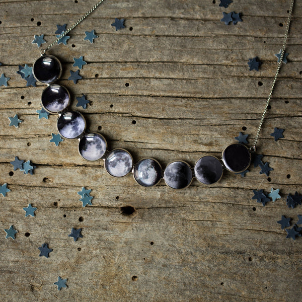 - Features a graceful, curved pendant showcasing nine distinct moon phases, elegantly arranged in a silver-toned arc.