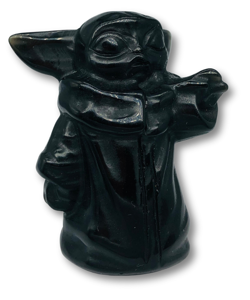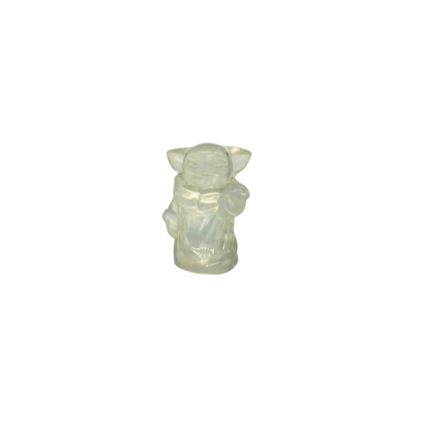 Gemstone Grogu measures approximately 2.25 inches high and 2 inches wide is a finely carved figure available in both obsidian and opalite. Each version highlights the unique qualities of its material—obsidian with its deep black volcanic glass and opalite with its smooth, milky translucence. At this size, it makes a charming addition to any collection, desk, or display shelf.