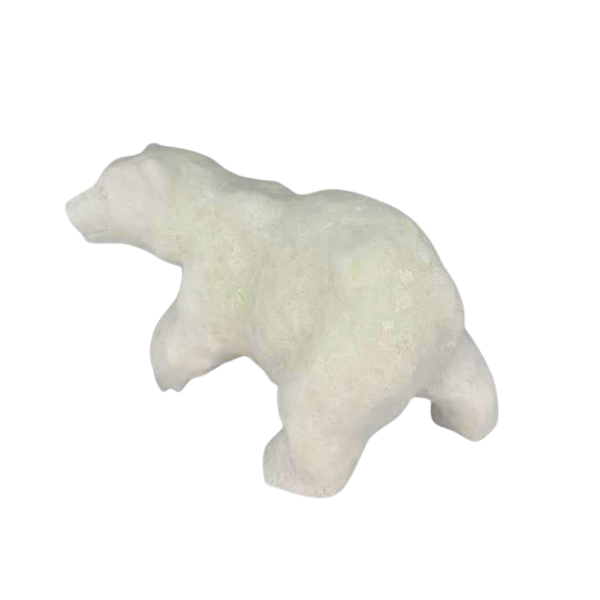 This sculpture is carved from natural marble, depicting a polar bear in a lifelike stance. Marble is a metamorphic rock formed from limestone under heat and pressure, known for its fine grain and ability to take a high polish.