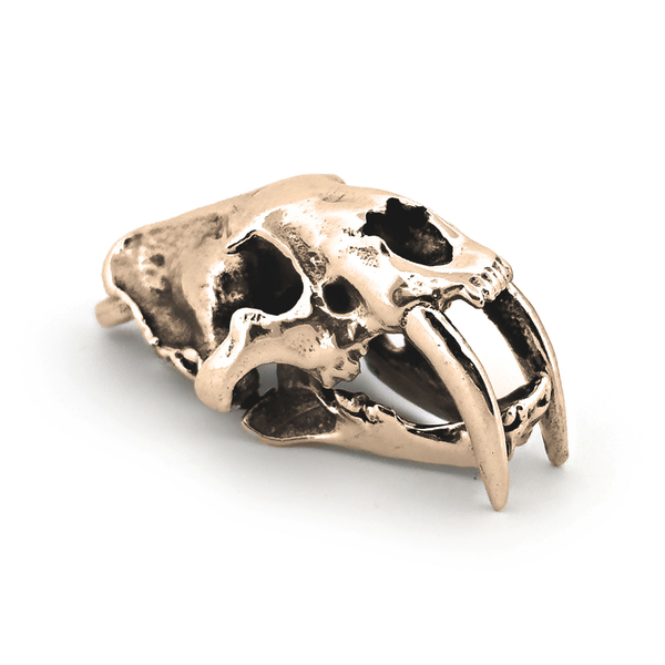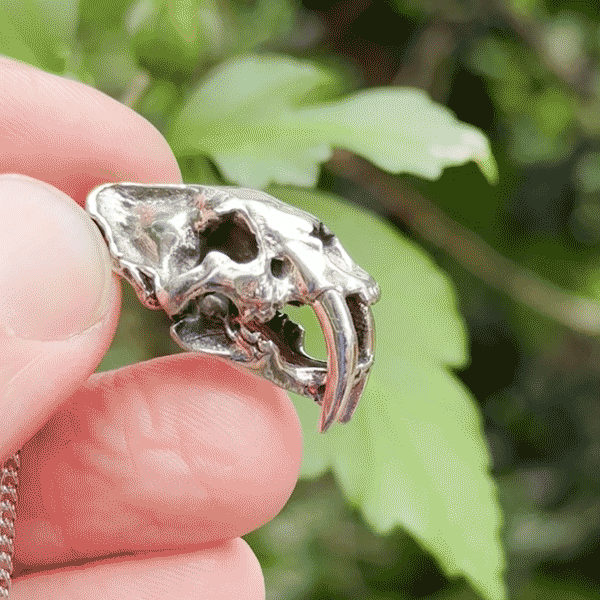 - Intricately sculpted Smilodon skull design with a hinged jaw
