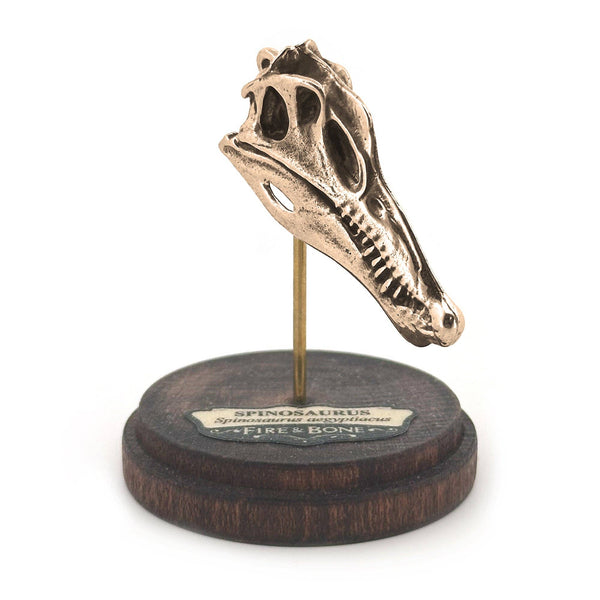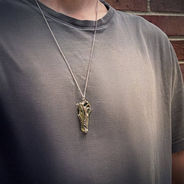 Dive into the Late Cretaceous with this yellow bronze Spinosaurus aegyptiacus skull necklace. This massive, semi-aquatic predator had a crocodile-like snout and conical teeth perfect for catching fish, and it was well adapted for life in river systems. Its distinctive tall sail may have been used for display or body temperature regulation. Includes a 24-inch matching chain and a wooden display stand so you can showcase your necklace when it’s not being worn.