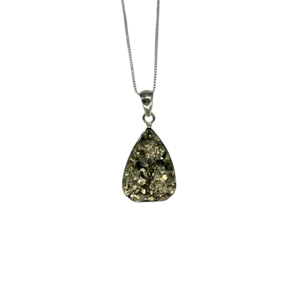This necklace features a natural pyrite pendant, showcasing the metallic luster and brassy-gold color characteristic of this iron sulfide mineral. Pyrite is commonly called “fool’s gold” due to its resemblance to gold.