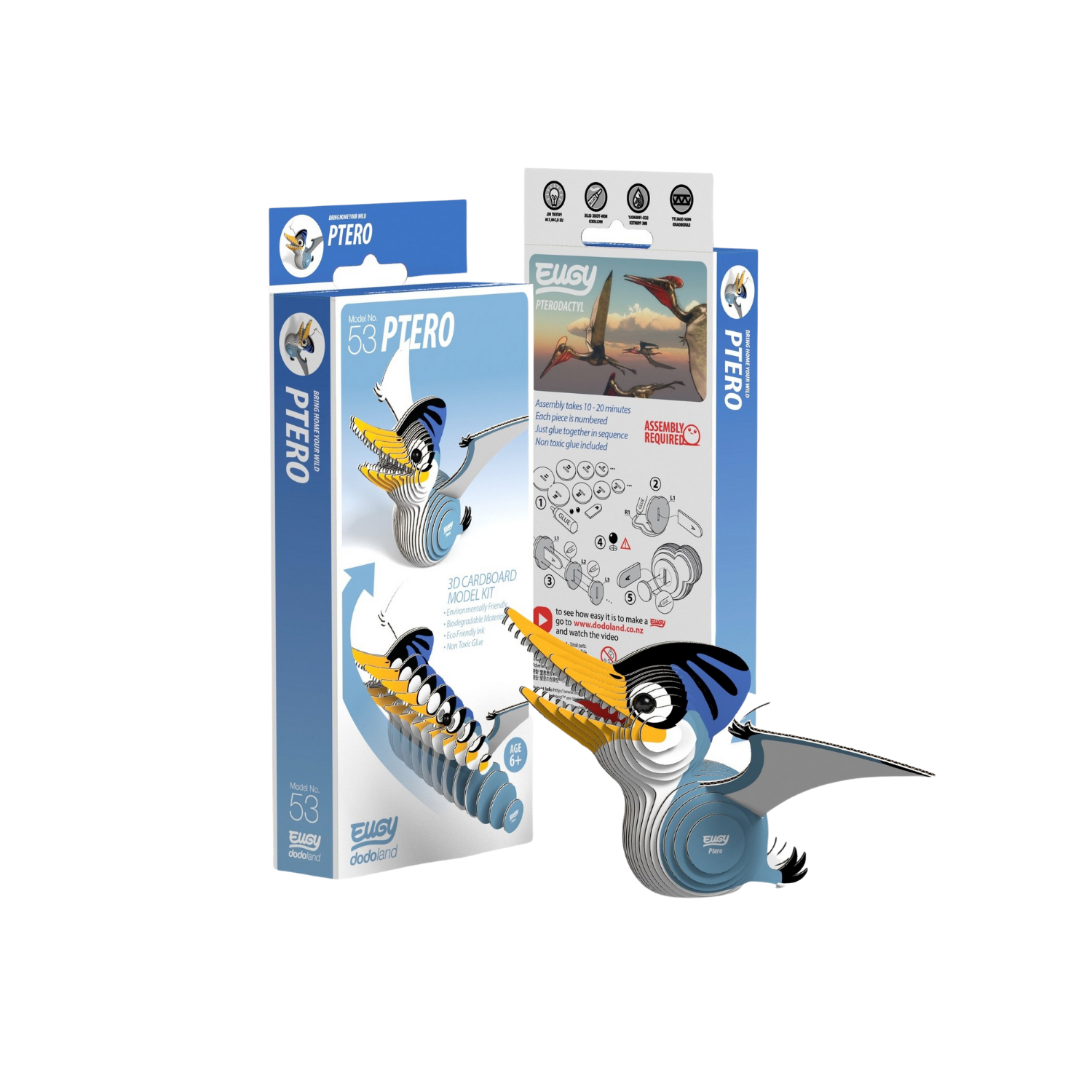 Construct your own 3D pterodactyl puzzle. Share the fun facts included as you enjoy the process and the product. Made with environmentally friendly biodegradable materials and printed with eco-friendly ink. Comes with non-toxic glue. An assembly video is available to assist with construction. Ages 6+.