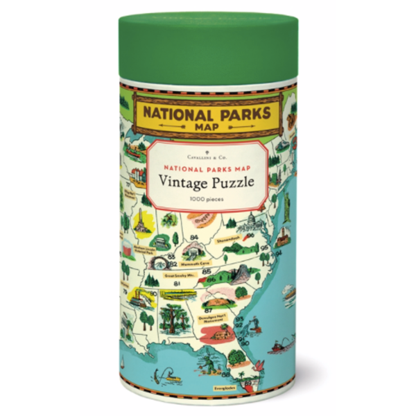 Puzzle featuring vintage National Parks imagery including a depiction of each state's parks.