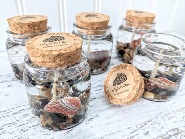 Bring the irresistible allure of the Lake Superior shoreline into your space with this Lake Superior Agate Gel Candle Mini. This tiny, handcrafted candle showcases hand-picked colorful stones and a genuine Lake Superior agate placed front and center, capturing the joy of discovery found along the shore. Made with clear gel wax, it delivers an impressive burn time for its size and a sensory experience inspired by nature.