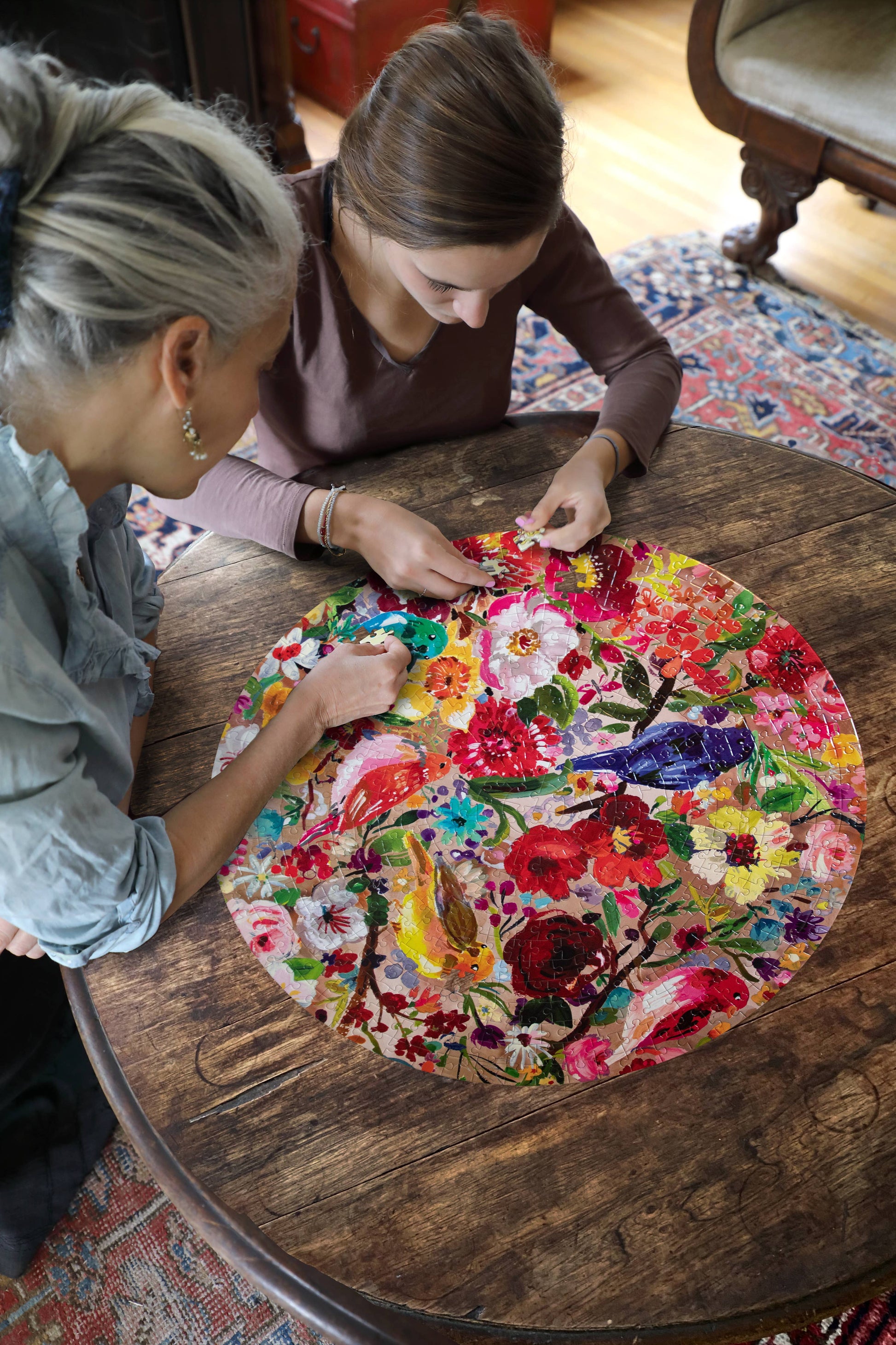 Feathers and leaves vie in this expressive painting by artist Jennifer Orkin Lewis.