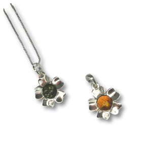 The Amber Flower Necklace features a delicate floral design with a polished piece of genuine Baltic amber at its center. Petal details surround the warm amber, creating a natural, graceful look that’s easy to wear and perfect for adding a subtle touch of nature-inspired style.