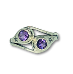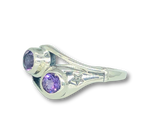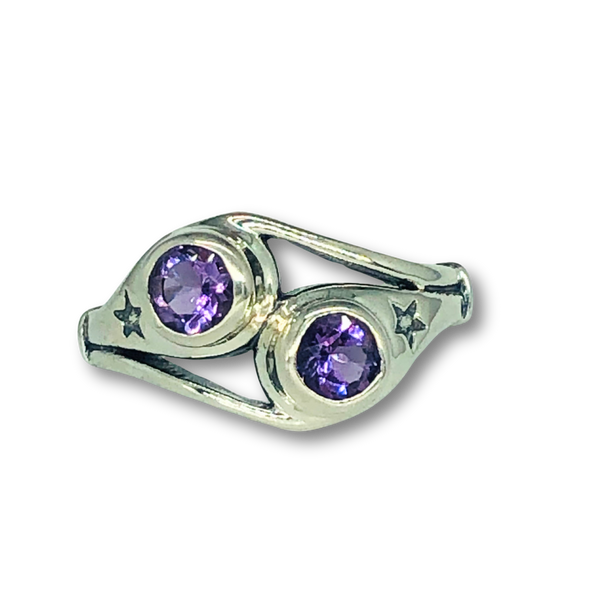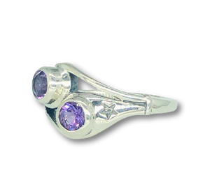 This enchanting ring features two radiant amethyst stones, nestled together in a delicate setting. Flanking the amethysts are intricate star details, adding a touch of celestial magic to the design. The rich purple hue of the amethyst stones contrasts beautifully with the star motifs, making this ring a dreamy, otherworldly piece for those who appreciate elegance and cosmic charm.