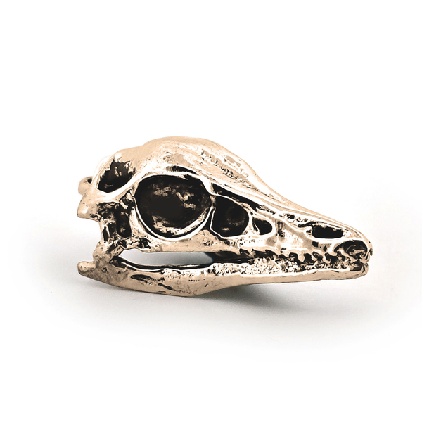 Celebrate the link between dinosaurs and modern birds with this detailed yellow bronze Archaeopteryx lithographica skull necklace. Known as the first feathered dinosaur, Archaeopteryx represents a remarkable moment in evolution—a true bridge between reptiles and birds. This finely crafted piece captures that prehistoric elegance with intricate fossil-inspired detailing. Includes a 24-inch matching chain and a wooden display stand to showcase your necklace when it’s not being worn.