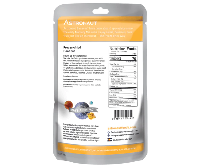 Astronaut Freeze Dried Bananas are a space‑age twist on a classic fruit snack, made from 100% real bananas that have been freeze‑dried using the same technology originally developed for astronauts. The freeze‑drying process removes moisture while preserving flavor and nutrients, leaving crisp, crunchy banana slices that are ready to eat straight from the package with no preparation needed. These bananas have a long shelf life—up to three years—making them a great choice for on‑the‑go snacking, outdoor adventures, lunchboxes, or space‑themed treats that inspire curiosity about food science and space exploration.