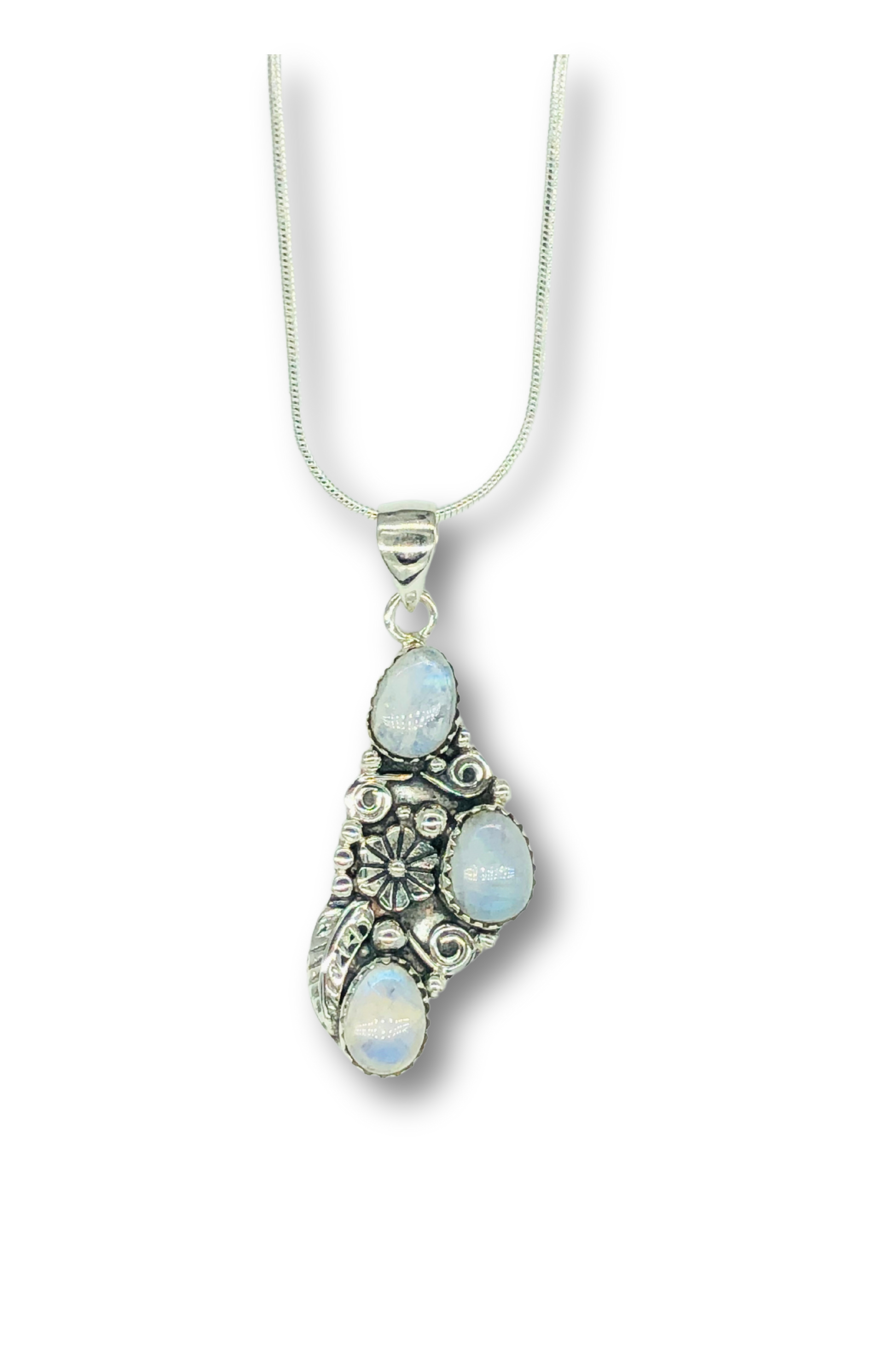 This Rainbow Moonstone Flower Necklace features three glowing moonstones paired with a delicate sterling silver flower accent. The soft shimmer of the stones and the floral detail create a graceful, nature-inspired design.