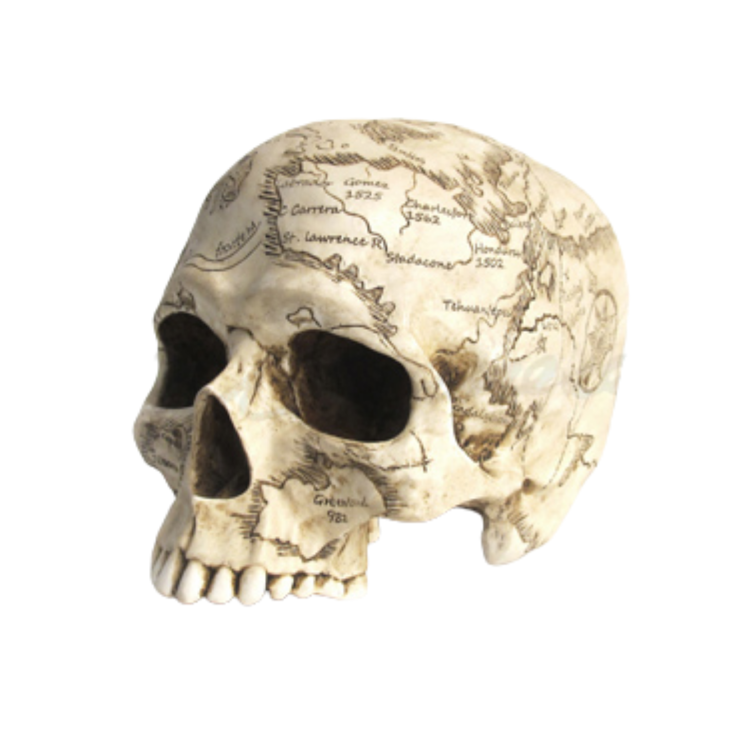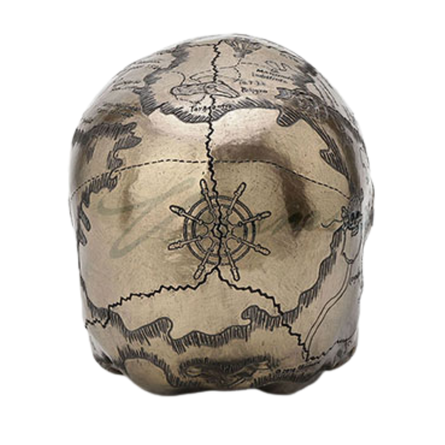 This is not your everyday skull, it's a pirate map! The darker-colored Steampunk Craniumography Skull is made of a product called "cold-cast bronze," a combination of resin and bronze dust. The lighter-colored skull is of cast resin. Each have been antiqued to enhance the details of its vintage vibe. This skull measures 7" in length, 5" wide, and 5" tall.