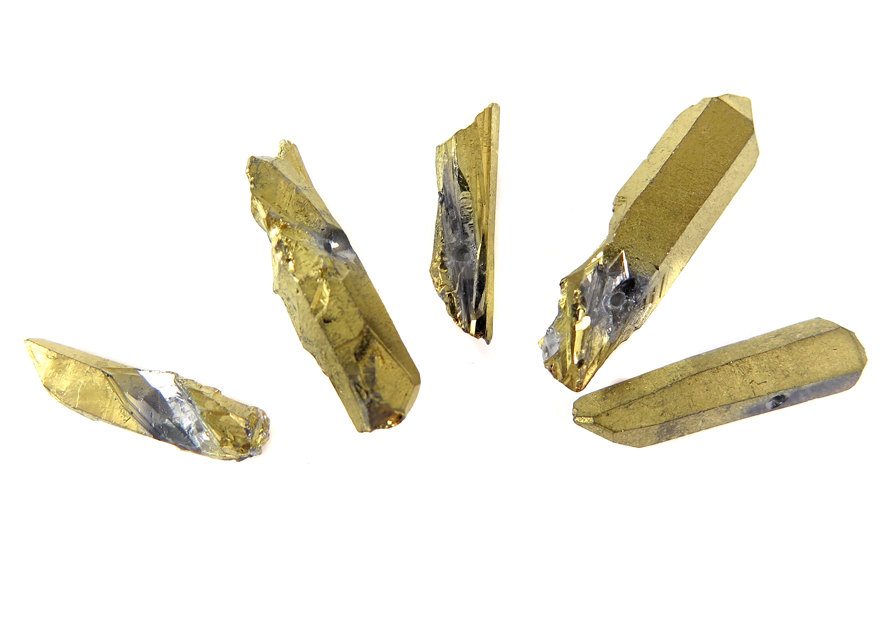 Vapor deposition of titanium gives this quartz is radiant, golden hue. Between approximately 3 and 5 inches.