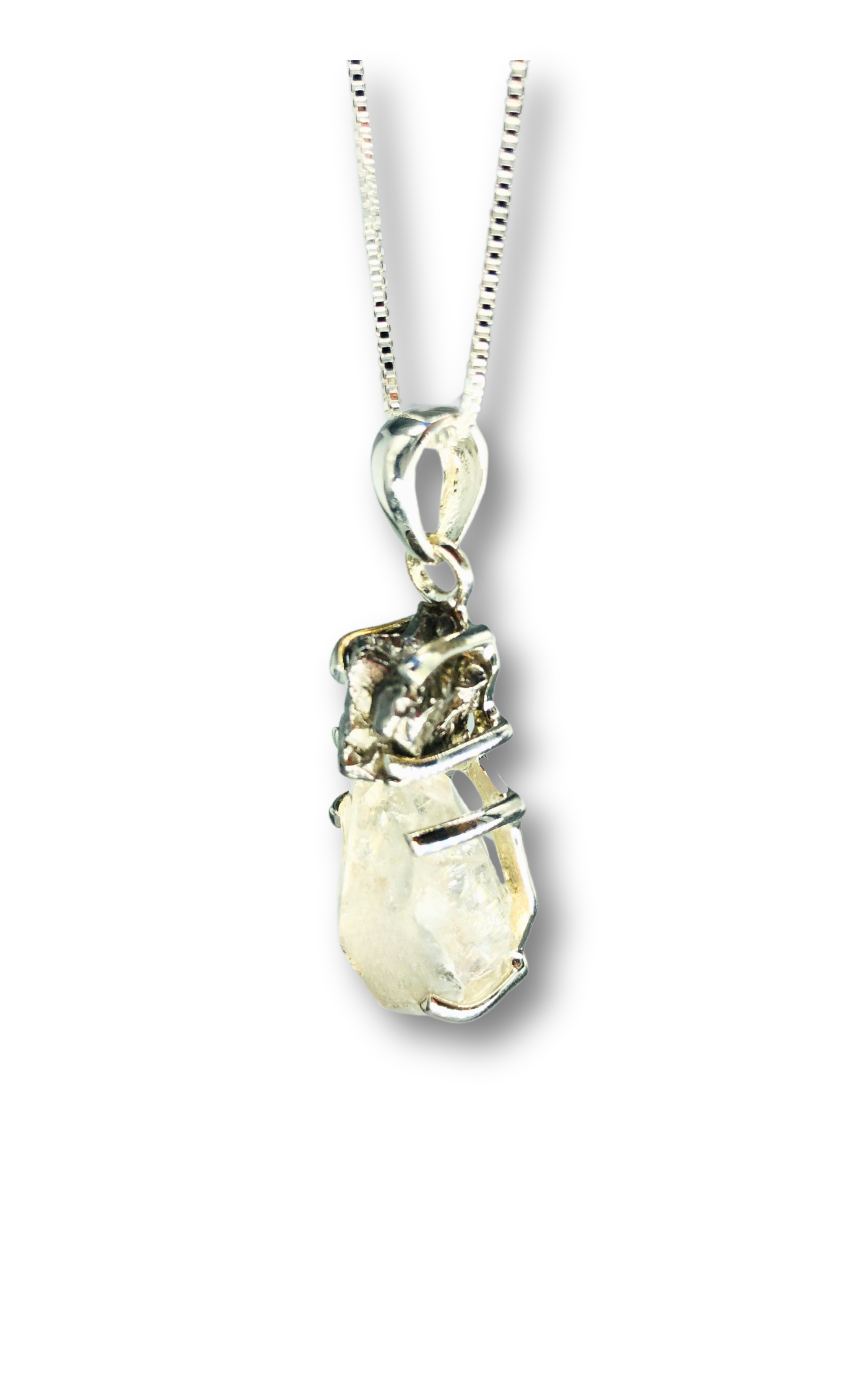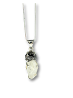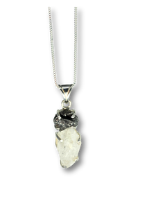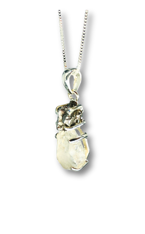 This one-of-a-kind necklace pairs the raw brilliance of a Herkimer diamond with the ancient, textured beauty of genuine meteorite. The Herkimer diamond, a naturally double-terminated quartz crystal, sparkles with clarity and light, while the meteorite adds a rugged, celestial contrast—formed in space and shaped by time. Together, they create a powerful fusion of earth and sky in a clean, modern setting.