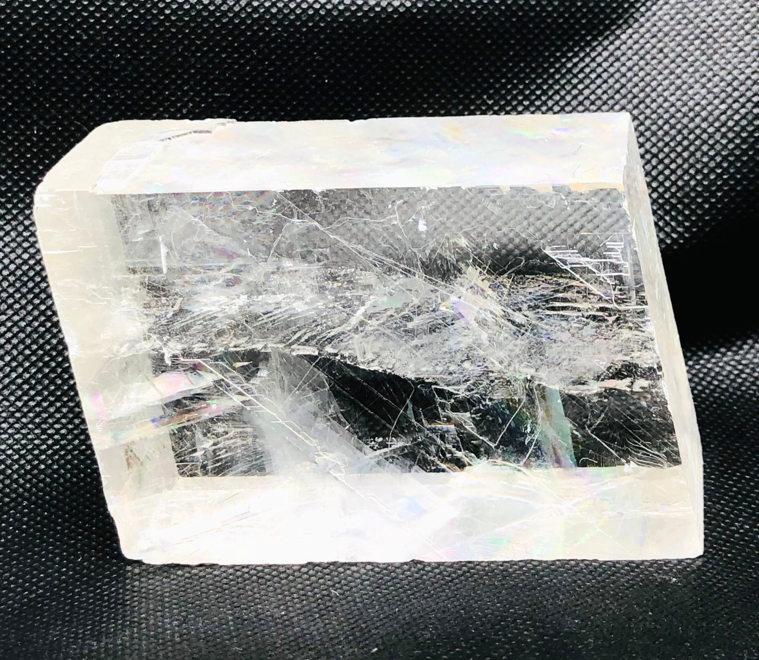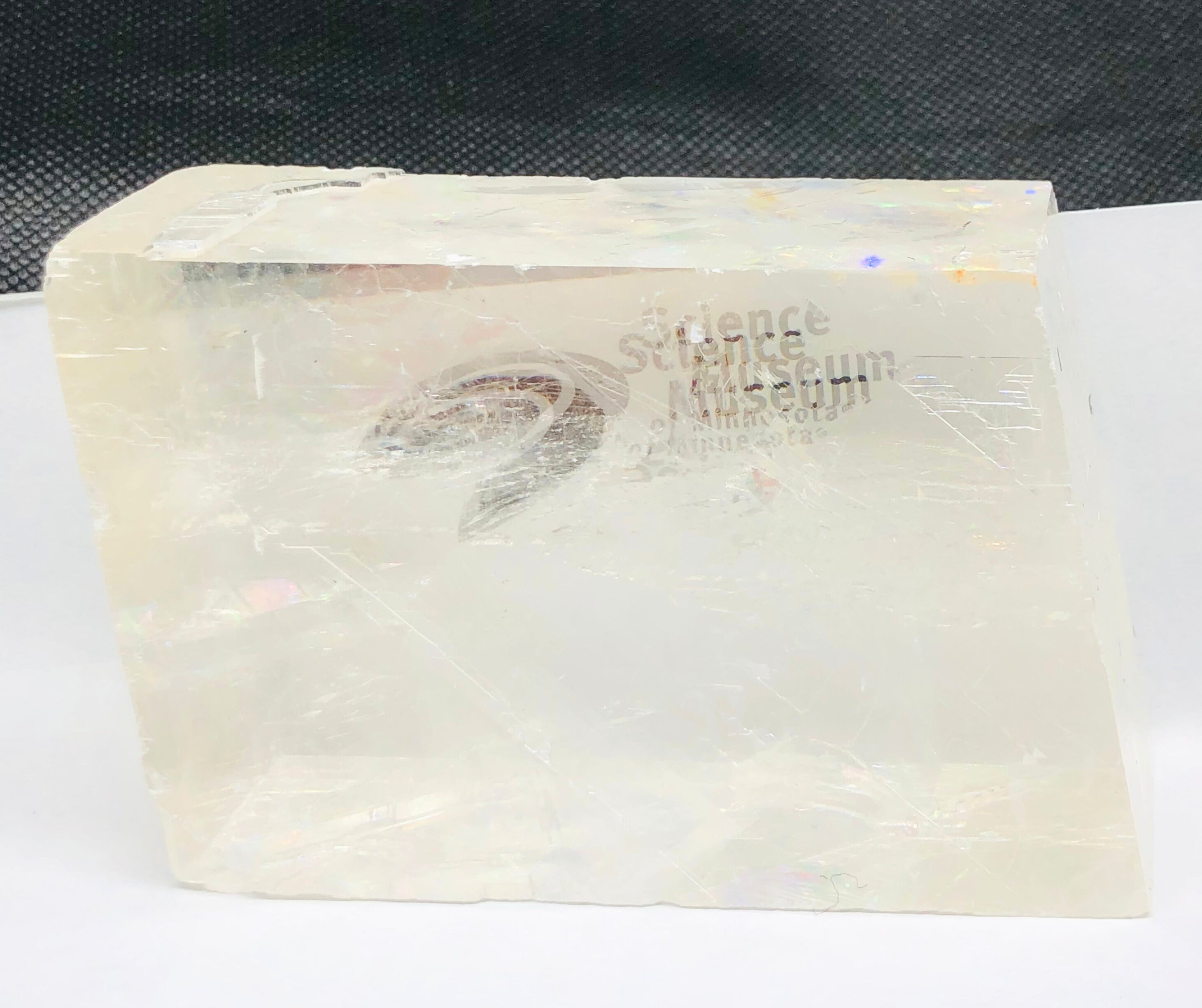 Iceland Spar, or Optical Calcite, is said to have been used by Vikings for navigation on cloudy days due to its polarizing effects on light, technically called birefringence. Each specimen is approximately 3.5-4 x 3-3.5 x 1.5-2 inches. Natural clarity and patterns will vary.