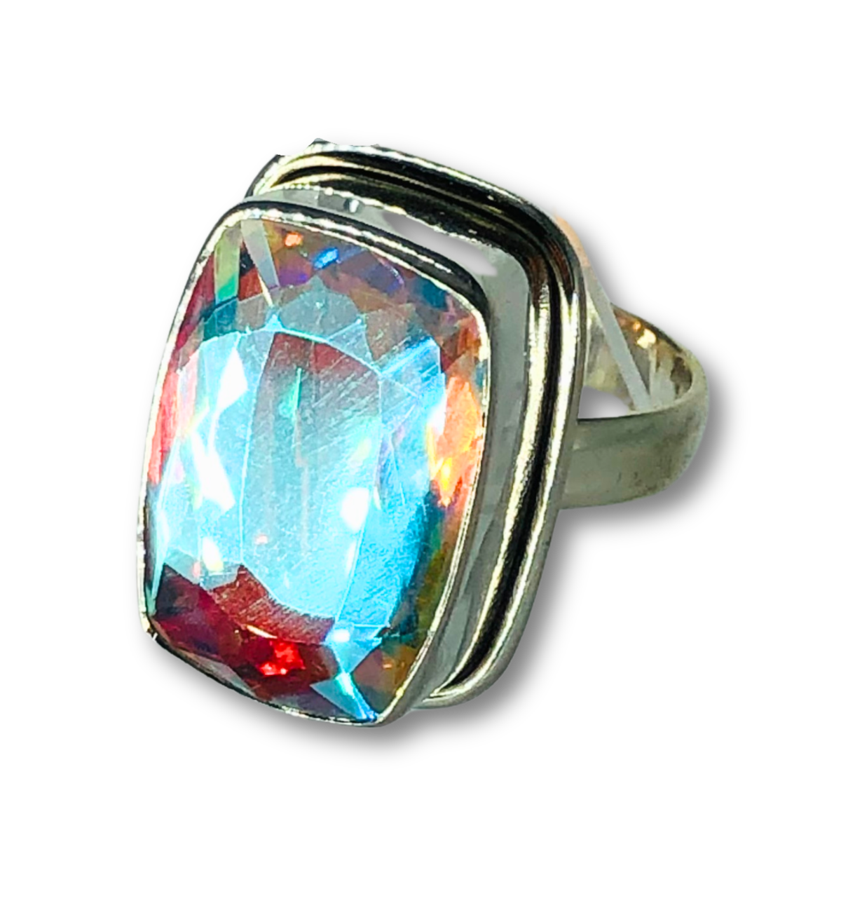This Mystic Opal ring features a dazzling play of color with flashes of green, pink, and blue that shift with the light. Set in a sleek band, it brings a modern touch to a classic, eye-catching gemstone.