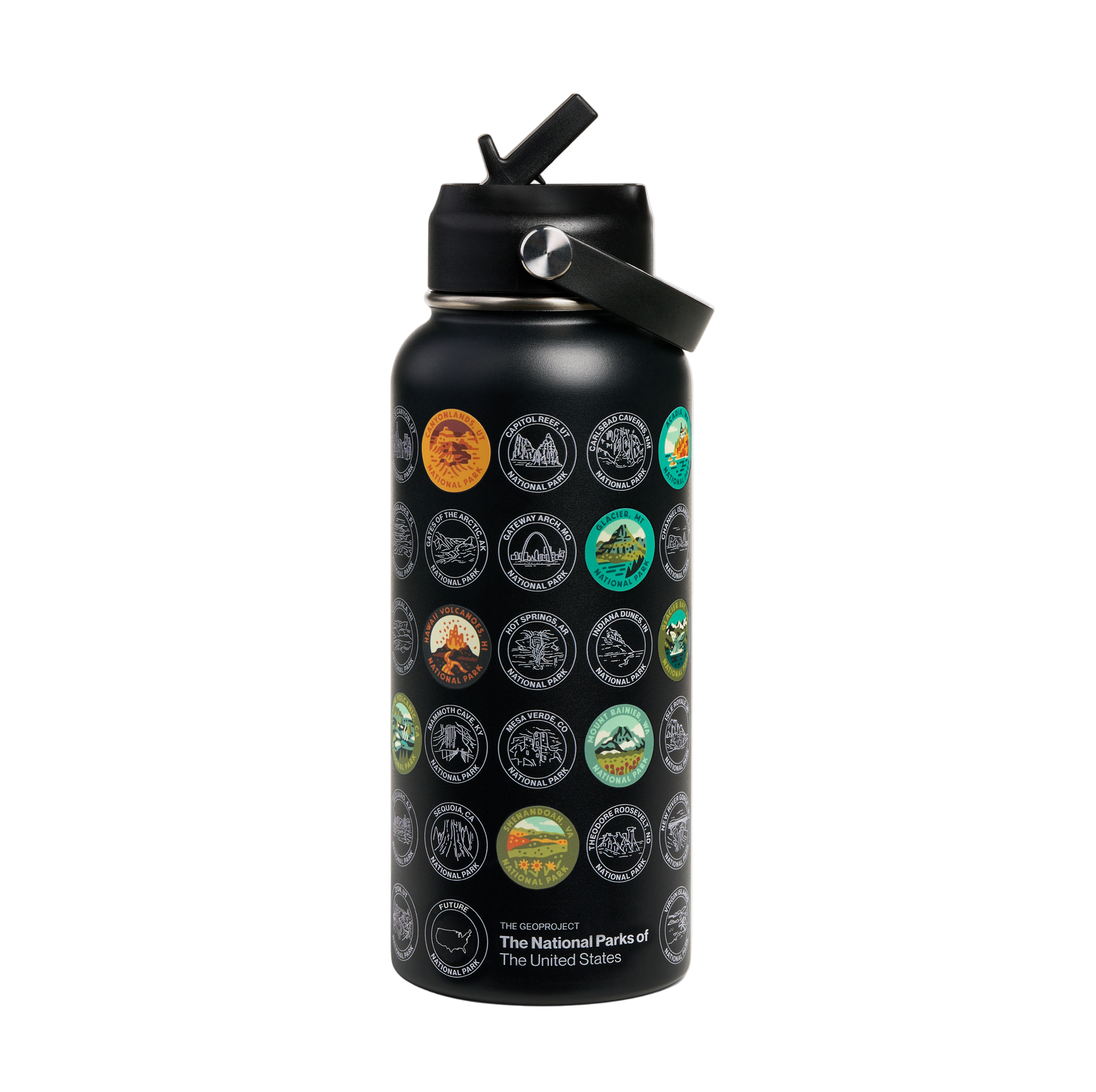 The National Park Sticker Insulated Bottle is a durable and interactive way to celebrate your adventures across the U.S. National Parks. This 32oz coal-colored insulated stainless steel bottle features all 63 National Parks UV-printed on its surface, allowing you to track your visits. Included is a complete set of 63 hand-illustrated stickers by artist Erikas Chesonis, so you can mark off each park as you explore.