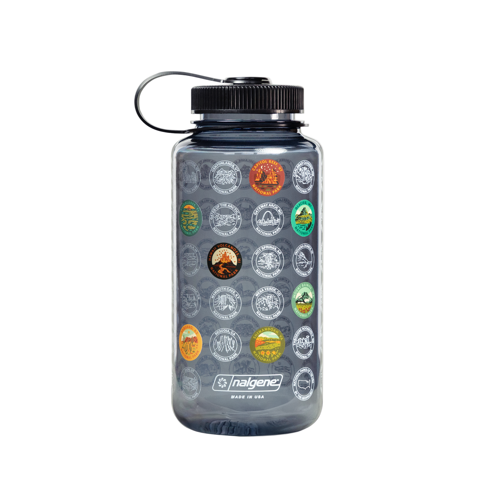 Introducing the National Park Nalgene Sticker Bottle, a durable and interactive way to celebrate your adventures across the U.S. National Parks. This 32oz coal-colored Nalgene bottle features all 63 National Parks UV-printed on its surface, allowing you to track your visits. Included is a complete set of 63 hand-illustrated stickers by artist Erikas Chesonis, so you can mark off each park as you explore.