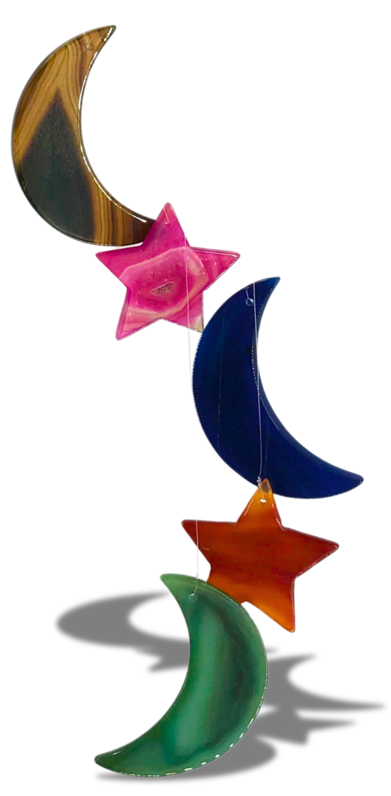 Five colors of the rainbow carved from agate slices into stars and crescent moon shapes. Hung in a waterfall array, they drape from a natural wood hanger to create this unique wind chime. Add color to your day. Approximately 20 inches long.