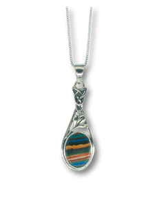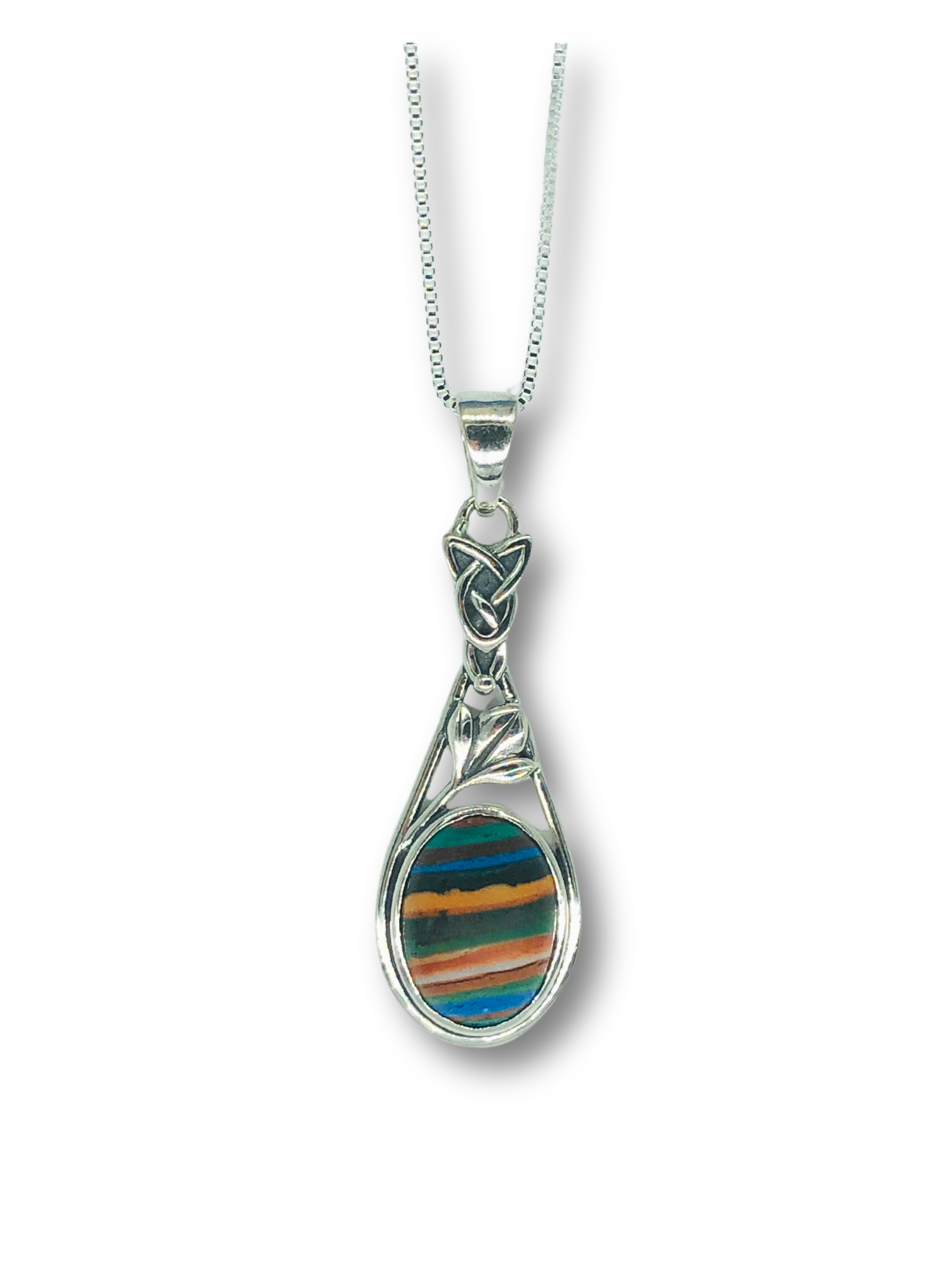 The Rainbow Calsilica Flower Necklace features a striking, multicolored stone set within a delicate floral-accented frame. With its vivid layers of blues, reds, greens, and yellows, each rainbow calsilica stone offers a unique burst of color, while the surrounding flower detail adds a subtle, nature-inspired touch. This piece combines bold color with soft design for a look that's both playful and refined.