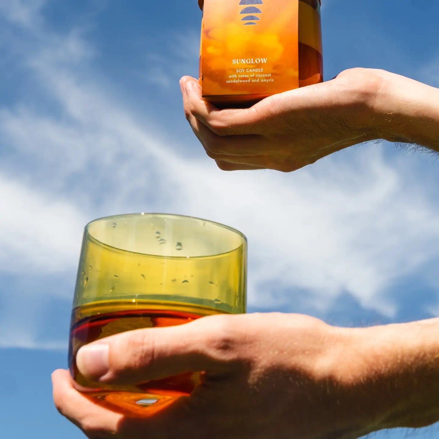- Candle vessel mirrors the soft hues of a sunglow horizon and can be repurposed as a delicate drinking glass once the candle is finished