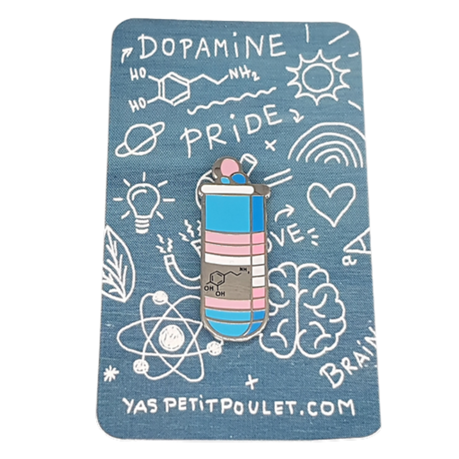 The Trans Dopamine Pin features a chemistry test tube design labeled with the chemical formula for dopamine, a neurotransmitter that helps the brain transmit signals related to reward, motivation, and pleasure. Styled with the colors of the transgender pride flag, this pin blends a chemistry-inspired design with a symbol of identity and visibility. It’s a meaningful accessory for jackets, backpacks, hats, or pin boards—perfect for anyone who enjoys science and celebrating authentic self-expression.